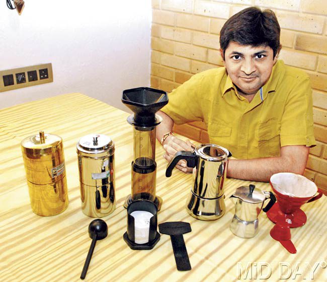 Mumbai-based brewing expert Jignesh Shah with the three coffee-making equipments (from left to right) the Indian Filter Coffee Maker (in brass and steel), Aero Press and the Moka Pot. Pics/ Shadab Khan