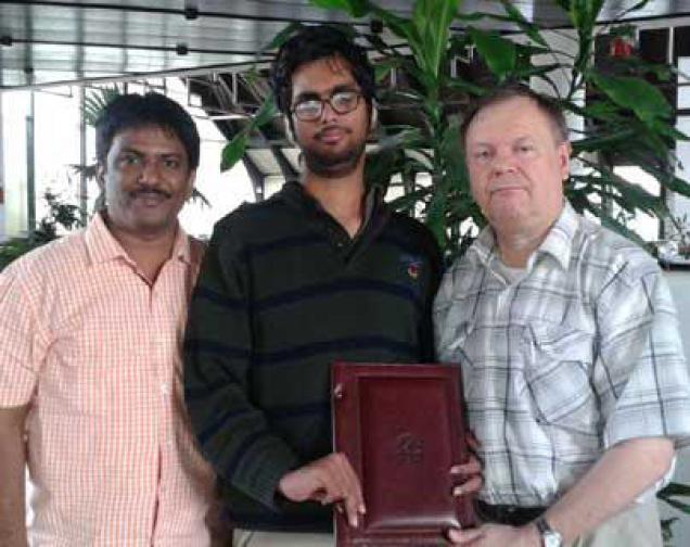 City chess player K.V.K. Karthik receiving FIDE Master title from IPCA president Pilimon Zbigniew at Serbia. Also seen is Karthik’s coach Shaik Khasim. Photo: By Arrangement / The Hindu