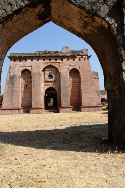 The Hindola Mahal seen through an arch in the Royal Enclave.
