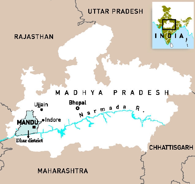 NESTLED in the volcanic plateau north of the Vindhyas in central India, Mandu has always been envied for its natural fortification. The town, located in Dhar district of Madhya Pradesh, about 100 kilometres from Indore, is separated from the main Malwa plateau by a deep ravine (Kokrah Koh) on three sides and drops on to the Nimar plain, around 1,200 feet below, on the south. This black-soil belt was once dotted with rain-fed lakes and dense forests filled with wildlife.