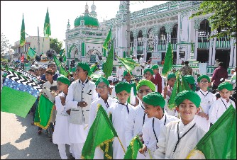 Later, a procession of tableux depicting Kabathulla of Makkah, Gumbad-e-Khizra of Madeena and other famous Masjids was taken out from Meelad Bagh to Dr. Zakir Hussain Circle.