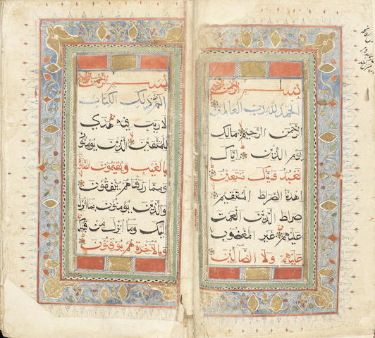 Arabic manuscript on cream-coloured thin paper, 632 leaves, 11 lines to the page written in large and dispersed bihari script, first, sixth and eleventh lines on each page written in red ink, remaining lines written in black ink with diacritics and vowel points in black, the work Allah and some other significant words picked out in red, gold rosettes decorated with blue and red dots between verses, inner margins ruled in blue and red, catchwords, circular and pear-shaped devices in predominantly red, yellow and white coloured panels between suras left blank, two double pages of illumination at beginning and end with outer borders decorated with intertwining stylised floral and vegetal motifs interspersed with gold lozenges, edges frayed, some tears, corners rather thumbed, some waterstaining mostly restricted to outer borders, discoloration, later brown morocco with stamped central medallions and cornerpieces of paper onlay, with flap, edges torn, covers stained, rebacked