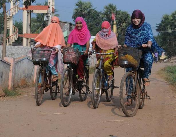 Girls cycle to school wearing colourful hijabs in Alinaqipalem. Photo: Ch.Vijaya Bhaskar | Photo Credit: Photo: Ch.Vijaya Bhaskar