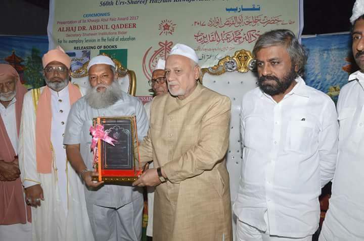 Dr. Abdul Qadeer has been awarded with “Hazrat Abul Faiz RH Award” Dated on 26 November 2017. This award presented to him on 560th death anniversary of Syed Khaja Abul Faiz RH. Dr. Abdul Qadeer, has been awarded for his excellent educational services and it has been presented by Syed Shah Hussain Shabir Hussaini sajjada Nasheen Dargah Hazrat Ganj bakhsh Rahmatullah Alai, Gulbarga.