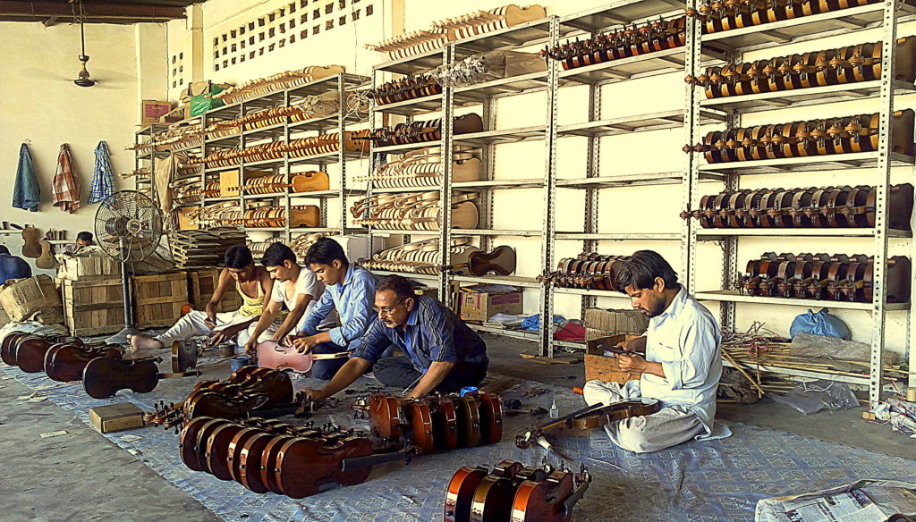 Workers put finishing touches to violins at Zamiruddin’s workshop in Rampur, UP. / Credits: Rohit Ghosh/Qrius