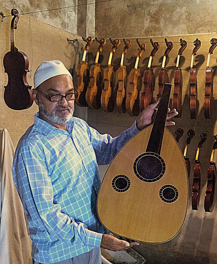 Zamiruddin uses the backyard of his house as his workshop, where 30-odd workmen sit cross-legged on the floor, designing violins and ouds. At any point, he has about 40 ouds ready.