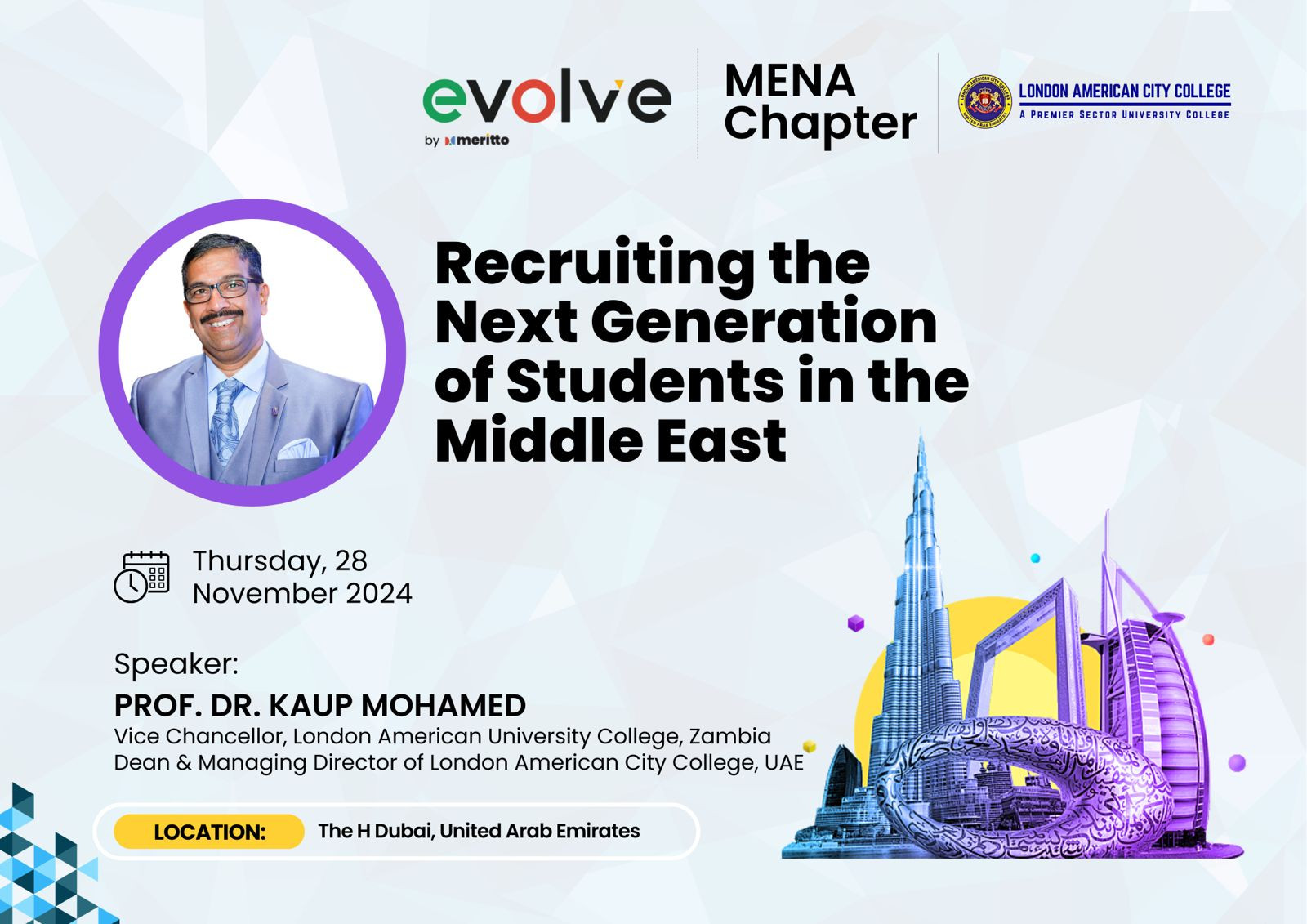 Dr. Kaup Mohamed, Dean and Managing Director of London American City College, UAE, and Vice-Chancellor of London American University College, Zambia, participated as a guest speaker at the MENA chapter of Evolve by Meritto.