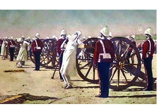 The method included lowering the muzzle of the gun to about three feet from the ground. The condemned man was then tied to the muzzle of the canon where small of the back touched the muzzle of the gun (in some cases, victim faced the gun where his stomach was touching the muzzle). Hands were tied to the wheels of the gun and in some cases legs were secured by tying ropes to tent pegs driven in ground near victim’s feet. About a quarter of the powder was used in cartridge shell; double charged in case of more than one person tied to the muzzle. The gunners stayed behind a back board to light the charge to avoid being sprayed with the blood and flesh of the dying man. Most of the time, one man was tied to the gun for each shot but in some cases four to six were tied together. Torso was disintegrated by the blast while head and limbs scattered over a wide area.