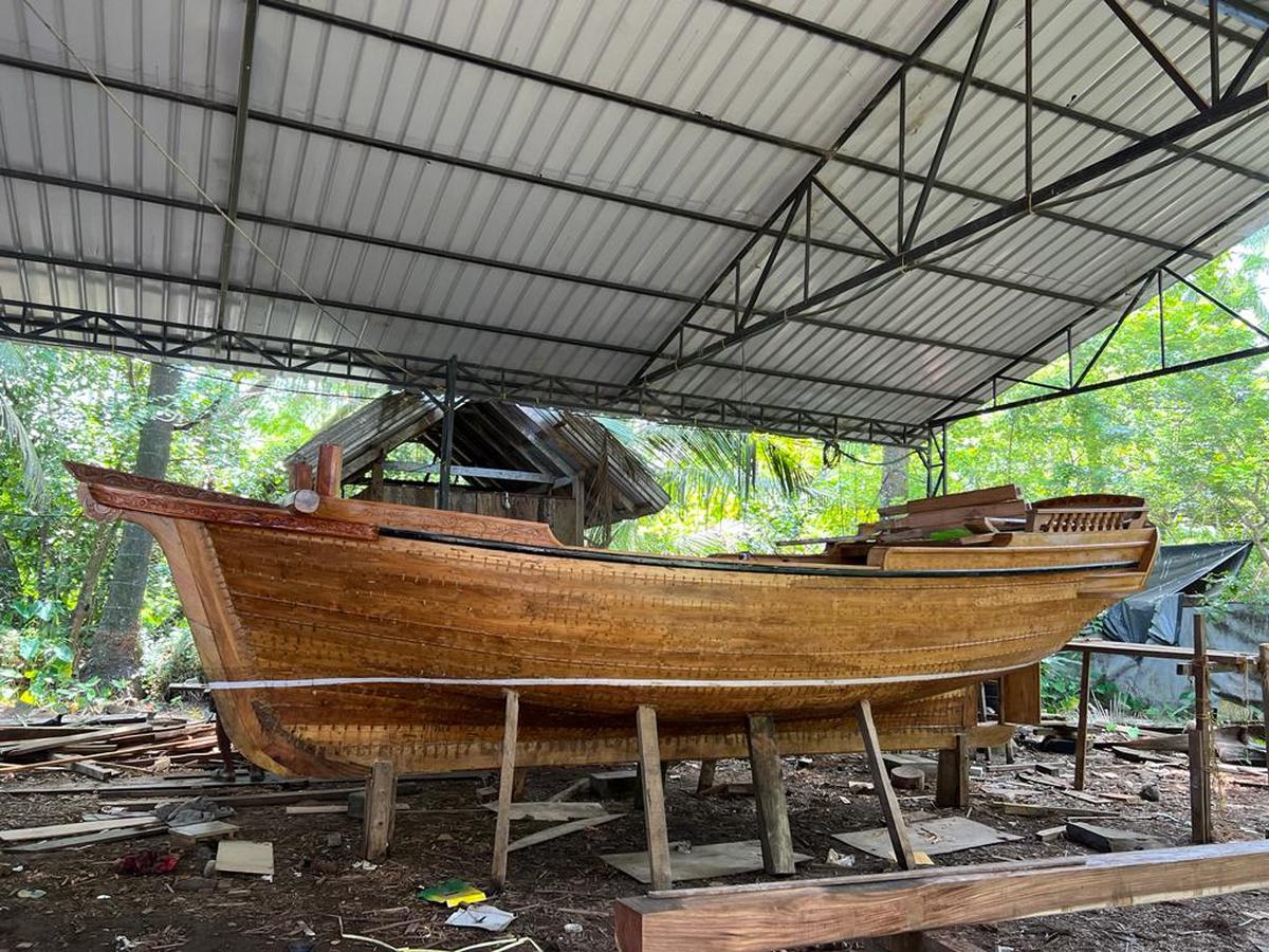 Over six to seven months, from November 2021, craftsman Gokul Edathumpadikkal and a team of shipwrights were busy assembling the six-foot deep and seven-foot wide vessel, using teak sourced from Nilambur. Most of the carpentry and detailed carving on the outer planks have been done manually.