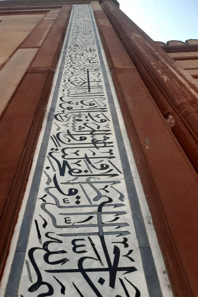 The imposing walls of both the Taj Mahal and Aligarh Muslim University’s Jama Masjid have Quranic verses crafted onto white marbles in black paint.