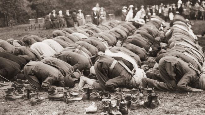 Indian troops serving with the British army pray outside the Shah Jahan Mosque in Woking, Surrey