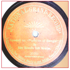 The National Grand Record label had a saffron disc with a rising sun as the logo. On it was recorded a speech by Babu Surendranath Banerjee, on the partition of Bengal. The flipside of this unusual 78-rpm disc has a speech on Bande Mataram.