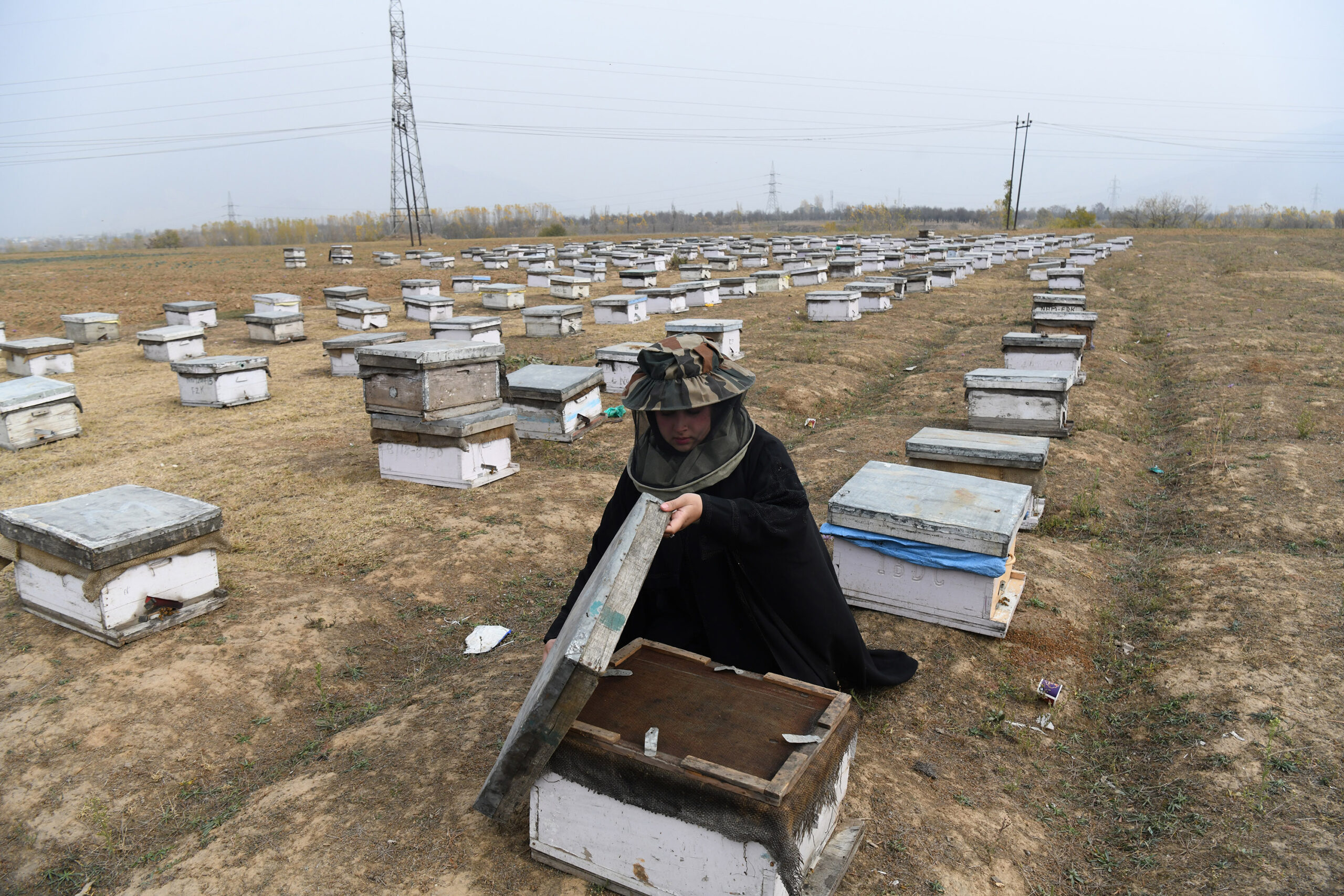 A Kashmiri beekeeper, Sania Zehra, displays a beehive full of honeybees at a farm in Pampore, south of Srinagar. Zehra, a young girl from Balhama on the outskirts of Srinagar, is working to revive her familyÕs beekeeping tradition, along with her father. Beekeeping in Kashmir requires more care during the winter as temperatures drop below zero degrees, making the bee farming a challenge.