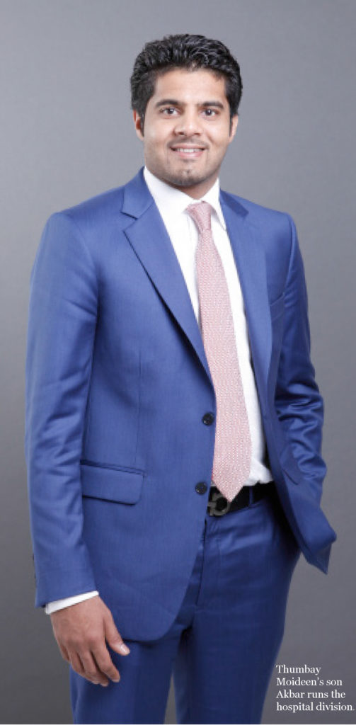 The plan for a teaching hospital began in 2000. For the first two years, students were sent to Iranian Hospital in Dubai, while Moideen built the first 200-bed Thumbay Hospital in Ajman. Financed with $81 million in loans from Islamic banks and his money, it opened in 2002, a year before the first graduating class. He opened three other hospitals with 60 beds each in Fujairah in 2006 and Sharjah in 2011, and 150 beds in Dubai in 2015. His eldest son Akbar who studied hospital management at the SDA Bocconi School of Management in Milan, Italy, runs the hospital division.