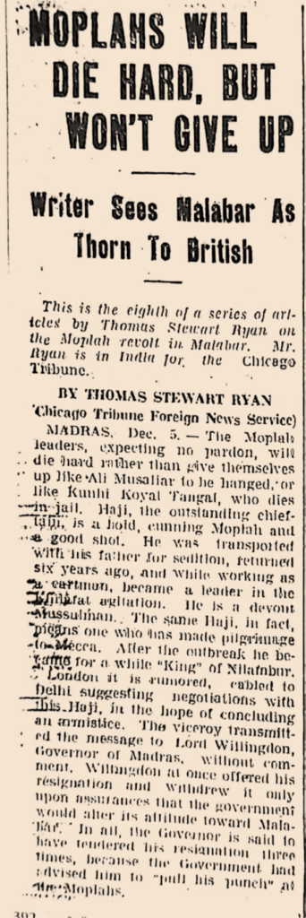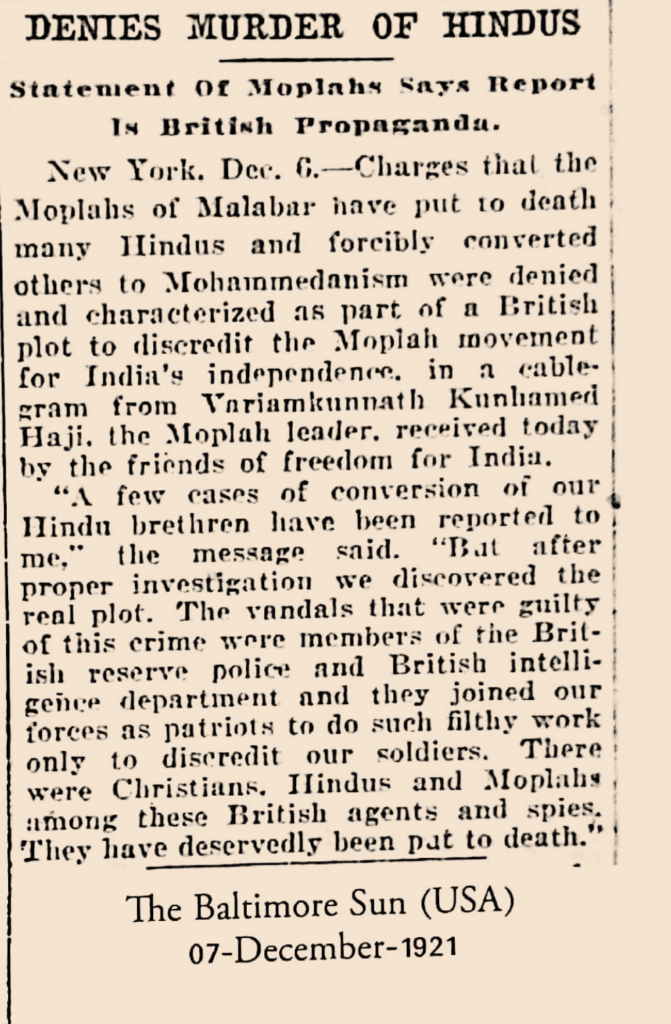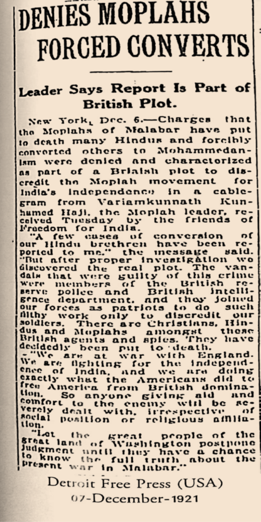 Hereunder are a selection of newspaper clippings, mainly from the US Press, extracted from the well-researched book just released titled, “Sultan Variomkunnan” by young historian Ramees Mohammed on the Mappila Uprising. These clippings furnish further evidence that the Mappilas were fighting for India’s Freedom and were not Anti-Hindu.