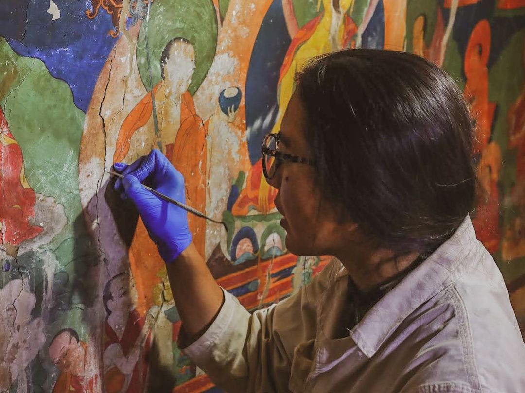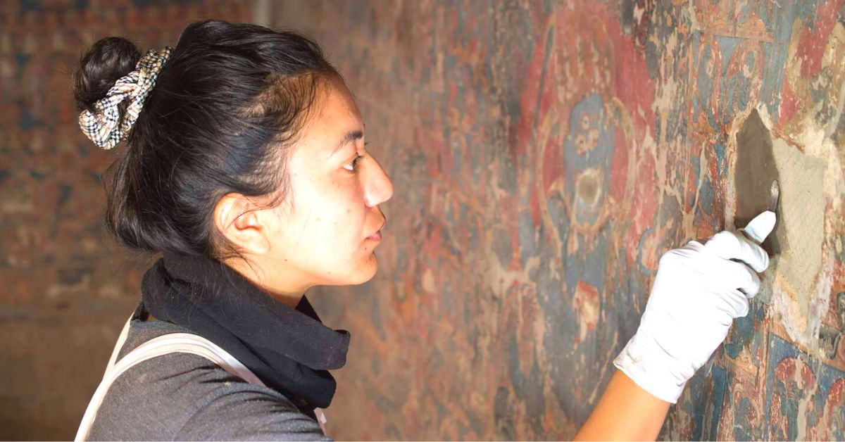 Noor Jahan working on old wall painting in Saspol caves, Ladakh