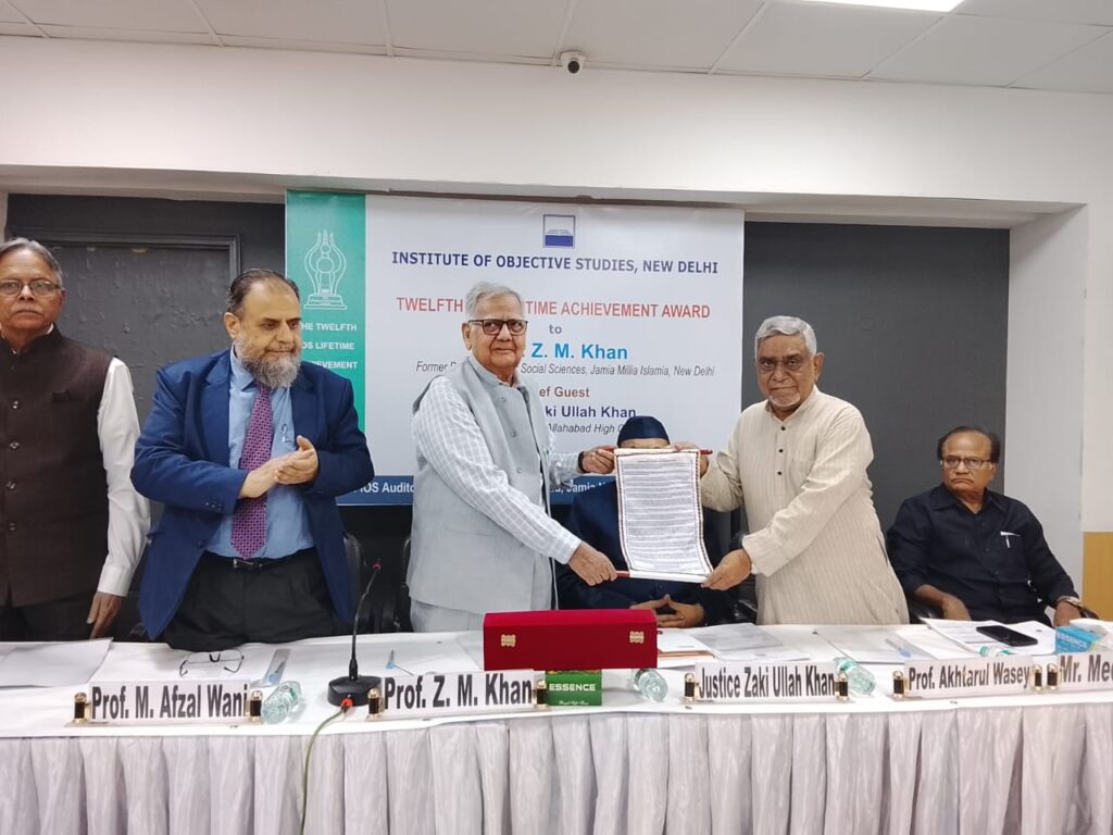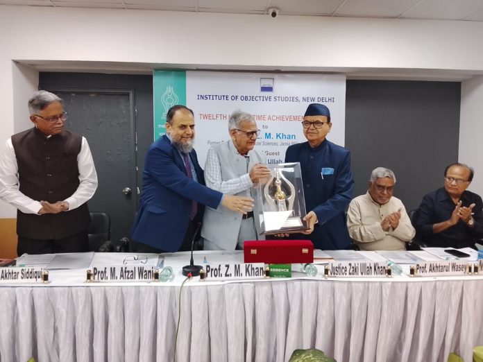 In a grand ceremony held in the capital, the Institute of Objective Studies (IOS) conferred the prestigious IOS Lifetime Achievement Award upon Professor Zahoor Mohammad Khan (Z.M. Khan)— an eminent scholar, researcher, author, and former Dean of Social Sciences at Jamia Millia Islamia.