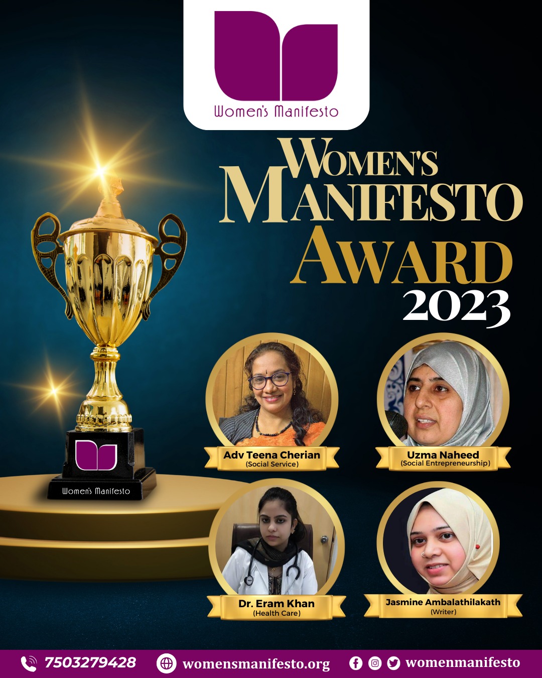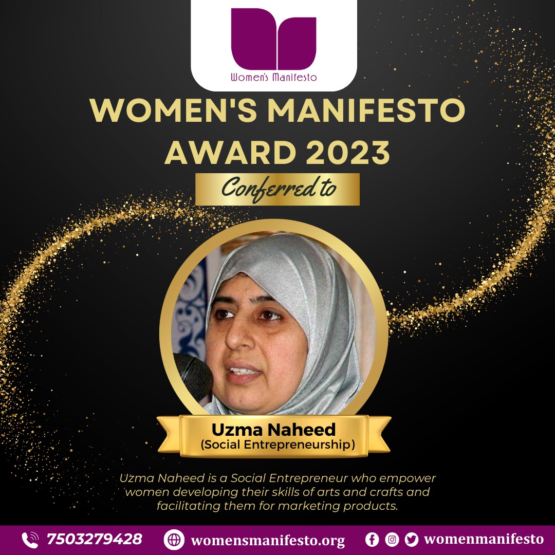 Women’s Manifesto is a national level organization initiated by women in 2014, Since its formation it engages in various activities for empowerment of women and welfare of society. To recognize efforts made by women or women managed organizations for rendering distinguished services for the cause of women and development of the nation, Women’s Manifesto confers Women’s Manifesto Award. It is given considering their excellence in the areas of entrepreneurship/ journalism/ art & culture/ academics/ sports/ literature/ social service. Awardees are selected from the nomination received and shortlisted after verification of information provided. Then it is finalized and selected by a team of three jury members. The candidate will be awarded with memento; certificate and cash prize of rupees ten thousand.