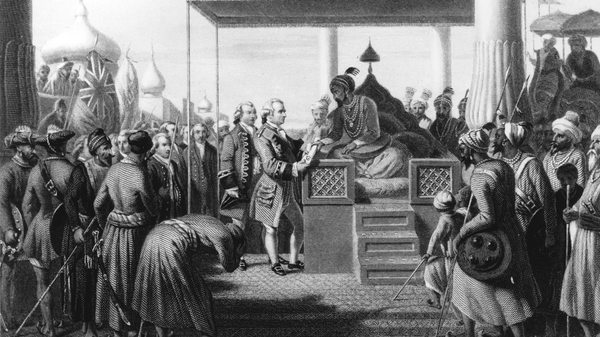 A sketch showing Robert Clive receiving, from Shah Alam II, the decree conferring on the East India Company the right to receive Bengal’s revenues.